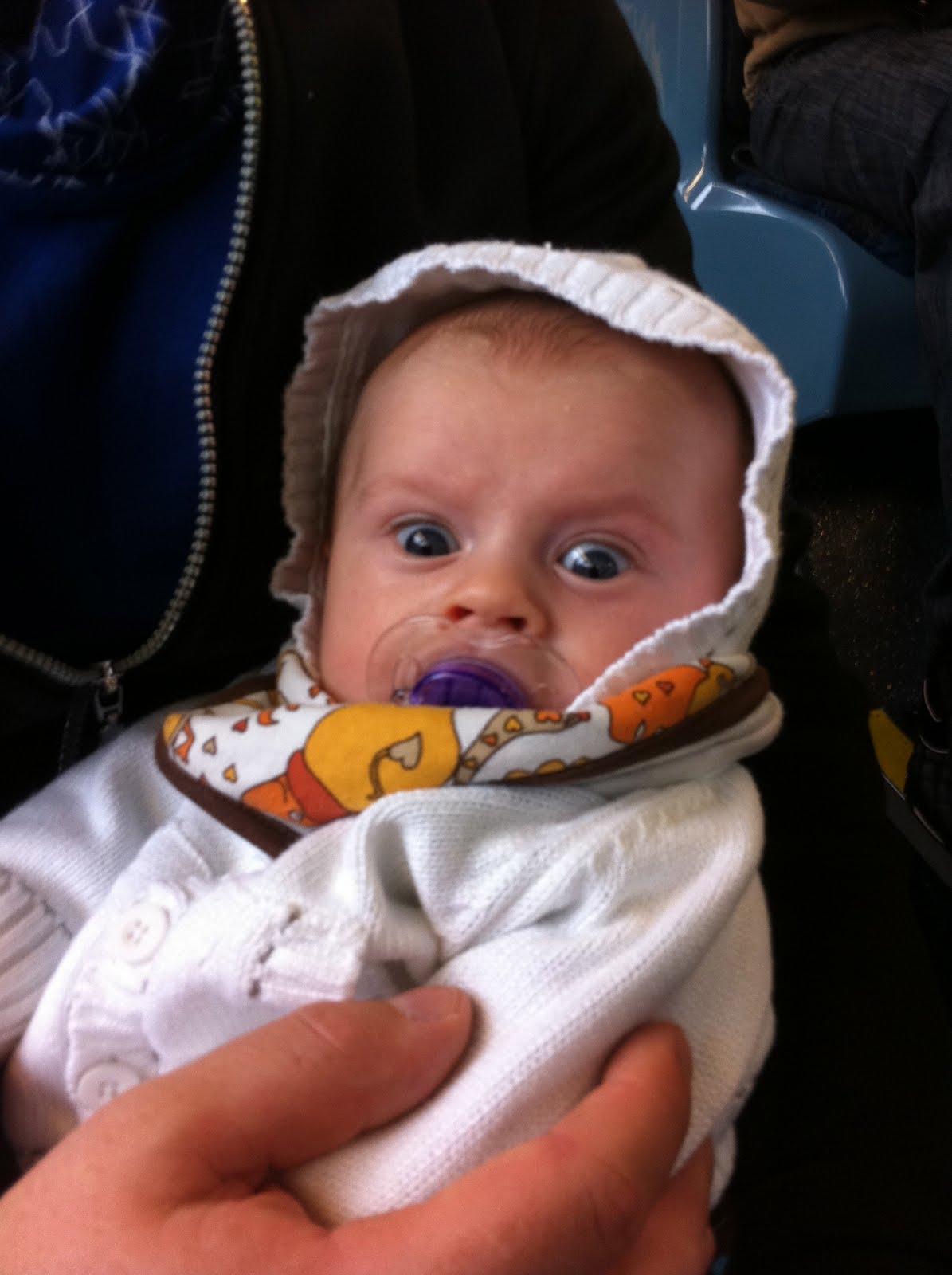 Today, on sunday we went to Hyde Park to meet my new friend Dave, who is my Daddy's old friend. Mummy and Daddy took my bouncy chair with us and I got to chill in it while they were talking about adult's stuff. It was warm(ish) but very windy, so I was in my 'Gruffalo'. Gruffalo is a bag where I go when I'm in my pushing car. It keeps me warm and cosy. Dave was very funny and I was happy to meet him.
